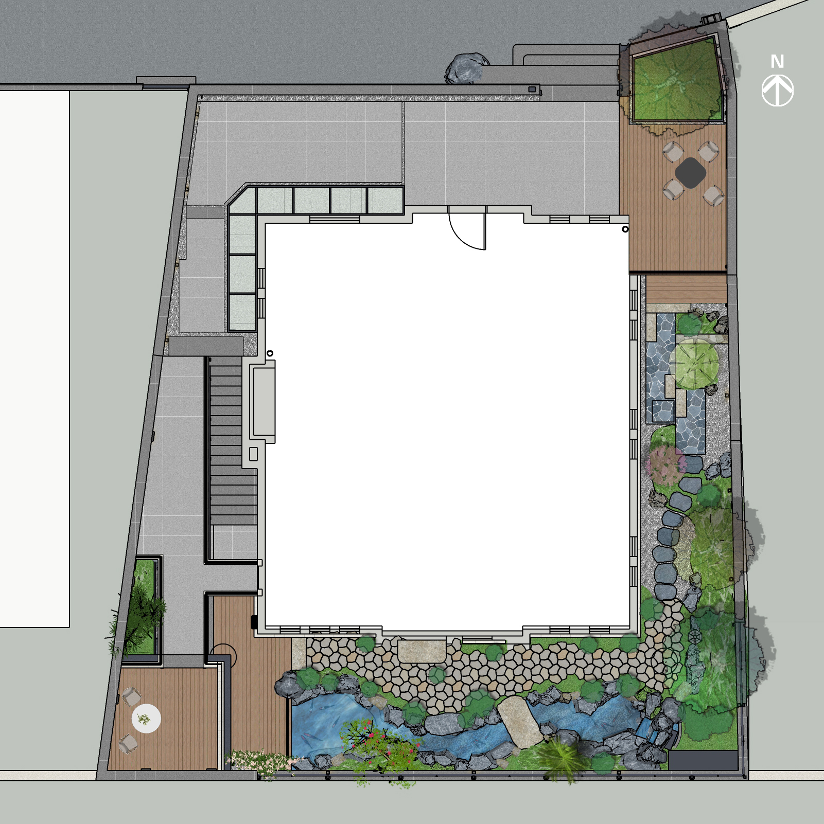 東側院連接室內榻榻米空間,出戶后設置木平臺和自然園路等,種植姿態飄逸的自然花木,如楓樹、紫薇、石榴、南天竹等,形成疏林空間,漫步在青石小徑上,感受陽光透過枝葉,灑落在草地上和墻上的光影,明暗搖曳,虛實相間,感受自然帶來的寧靜與和諧。沿溪而行,可臨石而坐,看魚兒自由地游動,或閑庭信步,感受那份漫步花園的美好時光。