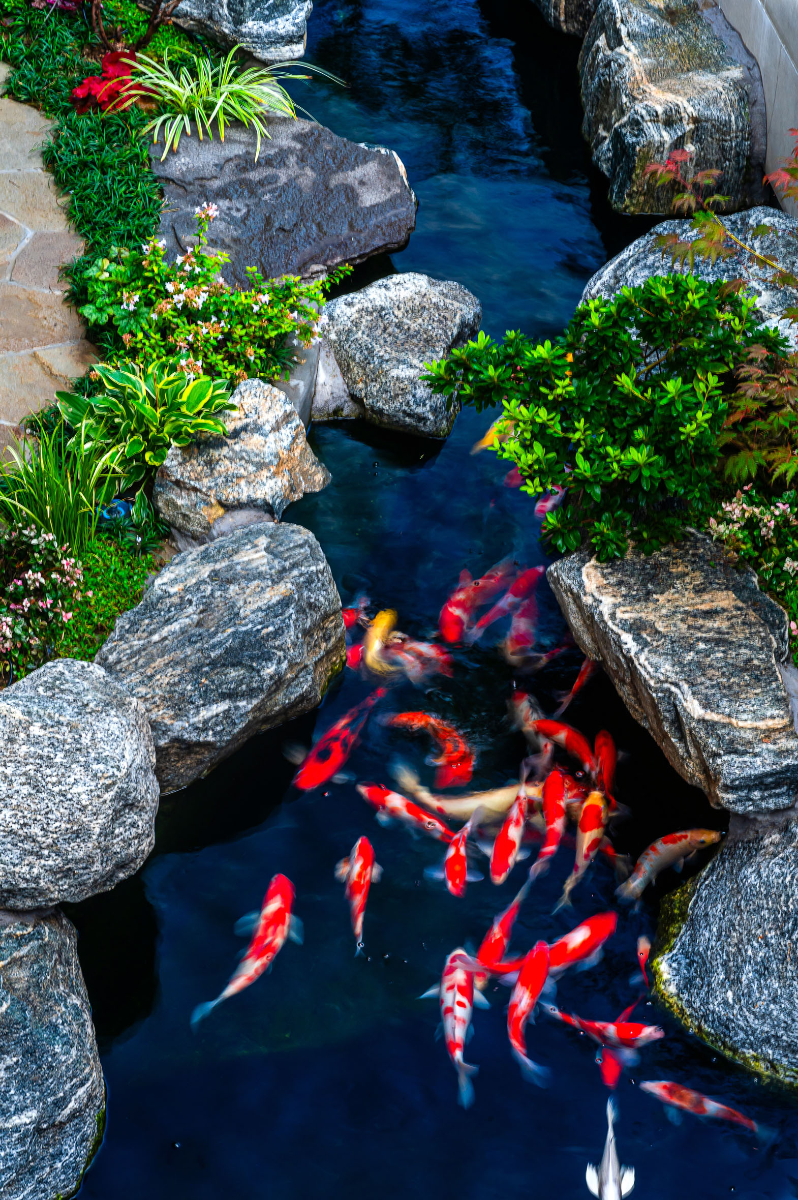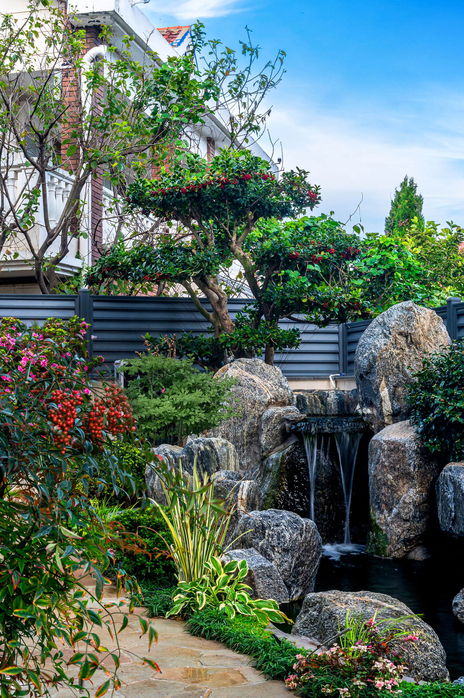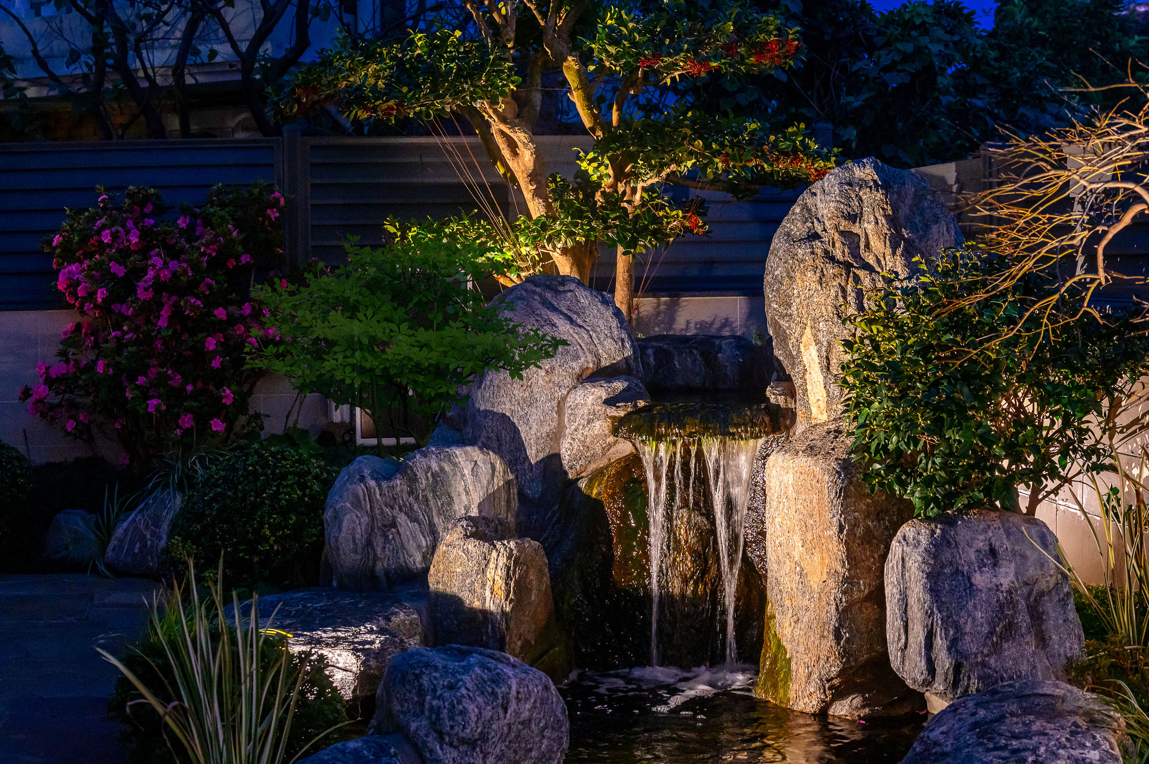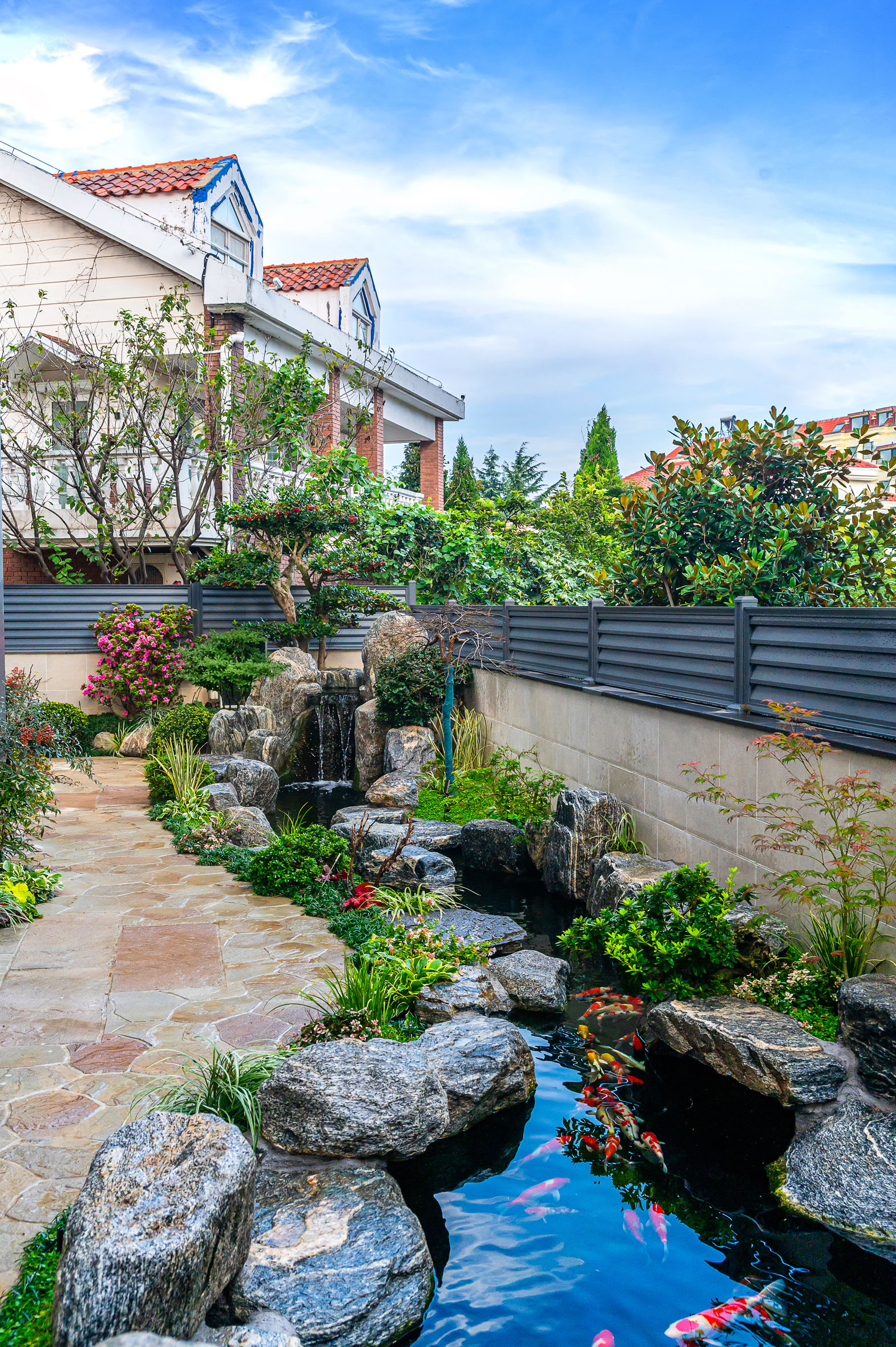 庭前山水相依、流水潺潺,清泉從假山流出,雖是人造的流水,亦如深山的瀑布。溪徑蜿蜒流向茶亭,沿河岸邊設置高低景石和石板橋,搭配楓樹、杜鵑球、玉簪、金葉石菖蒲等植物組景,為業主提供親水活動空間,可坐與岸邊石上觀賞池中錦鯉嬉戲,楓葉低垂,花木倒影,山水意境,讓人流連忘返。