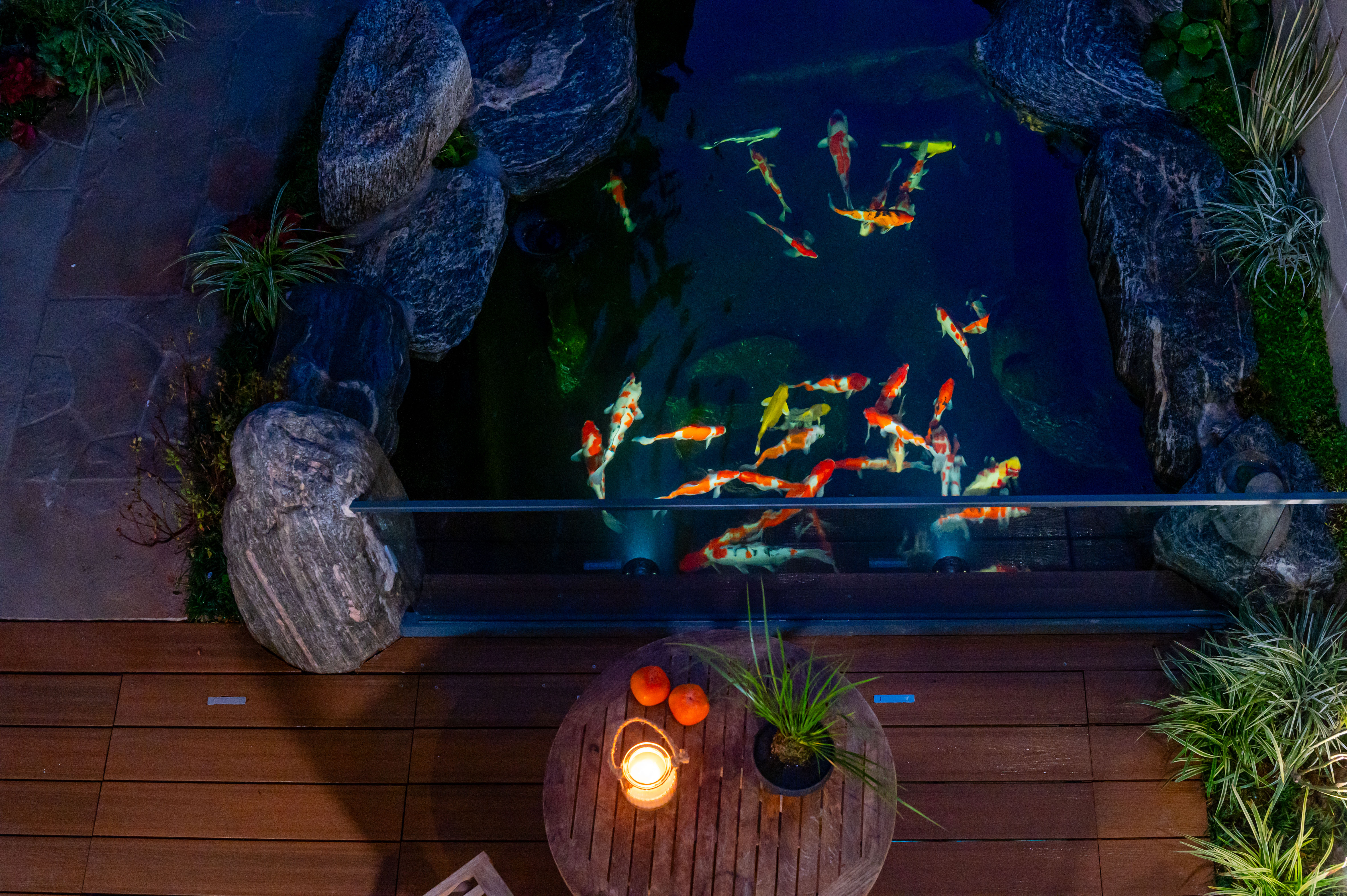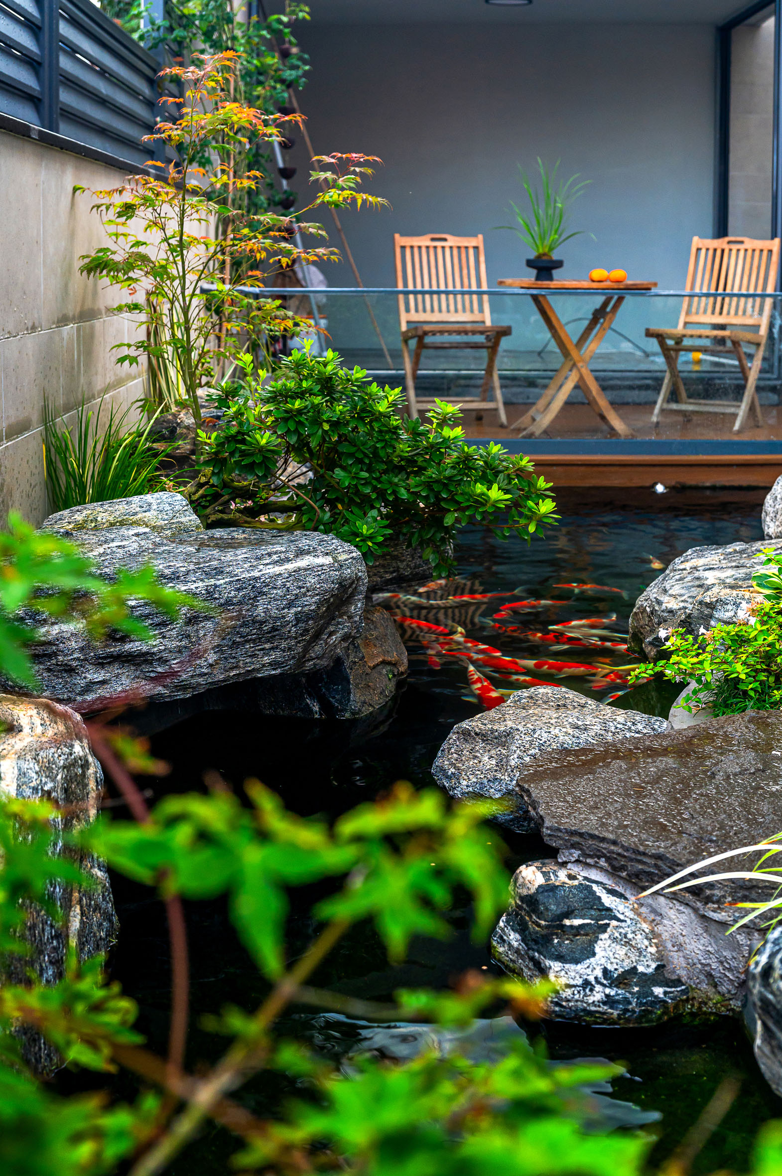 花園的茶室上方是一層的平臺,通過側院臺階下樓后即可到達茶室,也是花園的主要休閑區域,木平臺臨水而建,連接茶室和魚池。閑時與好友家人圍坐茶亭之中,煮茶品茗,風起花香,家就坐落在自然里,不必追尋那未知的遠方,精心布置好自己的一方庭院,散發著屬于“家”的溫情,享受這美好的花園時光。