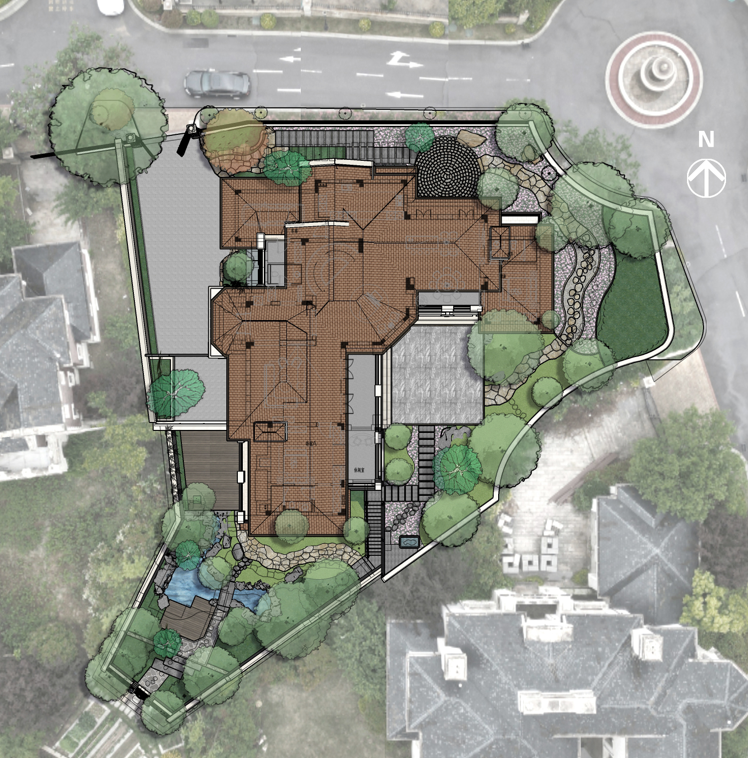 項目坐落于青島少海湖風景區之中,湖景環抱整個別墅區,環境優美,項目的花園高低不同,分上下兩層。可觀賞湖景的水色風光,亦可沉浸在美麗花園之中。在接手設計時的花園并不令人滿意,上層入口的大面積都在下層茶室的頂板之上,導致了該面積區域都是簡單的鋪裝,其他區域的植物雜亂無序,缺乏美感。在與別墅的主人溝通中了解到她希望自己的院子能更好地被利用與提升。花園的風格定位以自然、淡雅為主,搭配造型優美的植物營造出自然美好的意境。通過入院、游園、停留、活動、交流、休息等場景及功能需求,充分結合利用現有的布局和元素,打造自然舒適的花園空間。