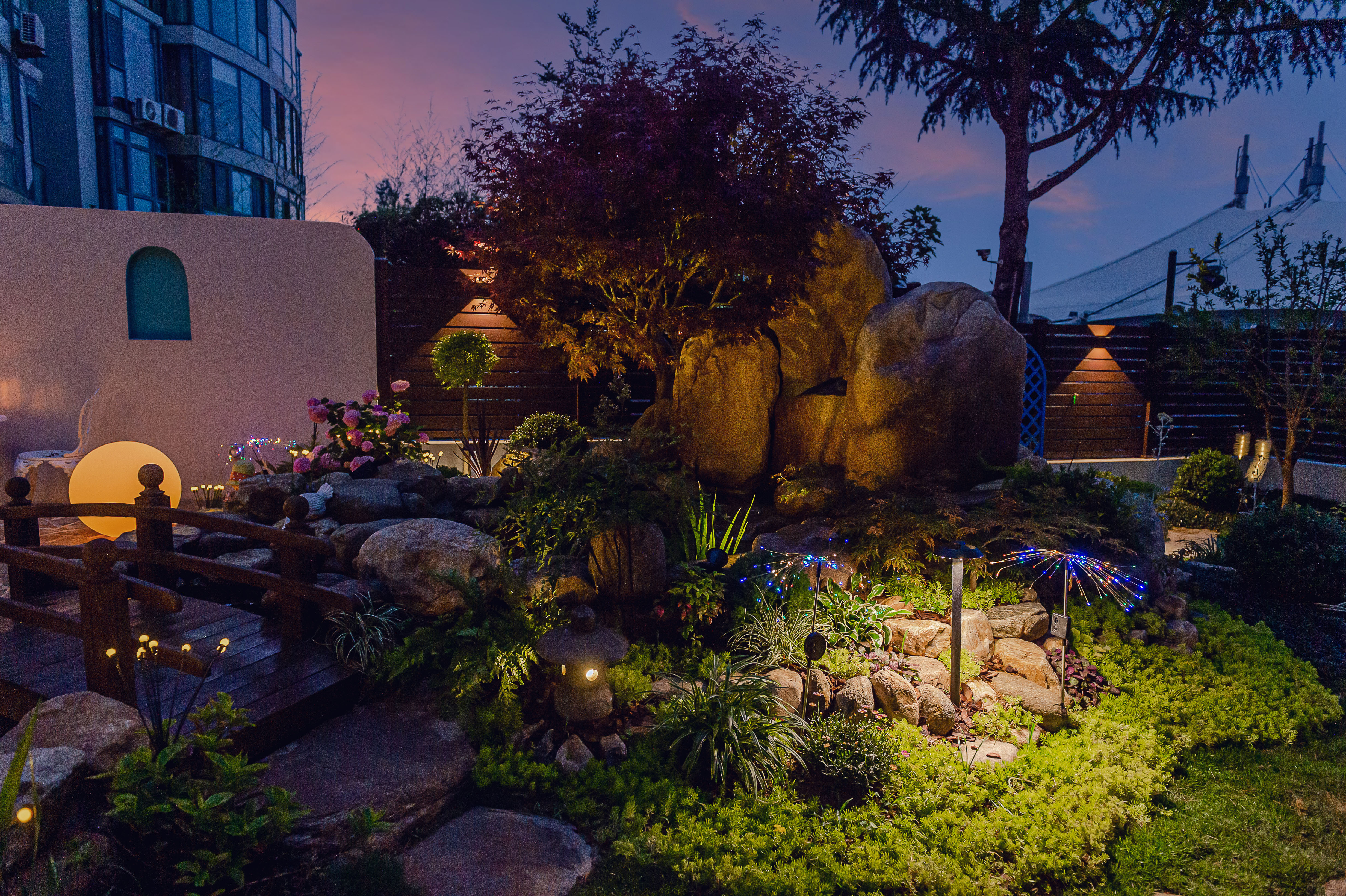 清晨,睜開雙眼,推開窗戶,呼吸著院子的花香,青草味,聽著鳥叫聲,看家中的貓咪與狗狗在草地中快樂地穿梭著。傍晚躺在秋千上看日落和晚霞,感受著院子里溫柔的風。夜晚,花園化身成為神秘的世界,在院子里看繁星點點,沐浴在柔和的燈光中放松身心,在這寧靜的夜里,只聽到潺潺的溪水聲,讓人卸下了一整天的疲憊。